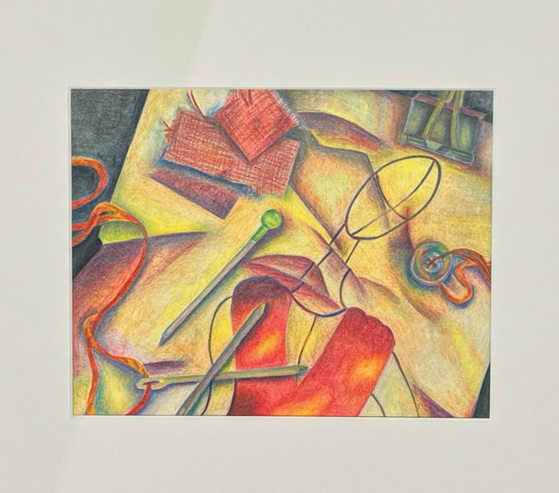 “Fashionable Desk,” 8in x 6in, Colored Pencil Surrounded in Foam Frame, 2021.
